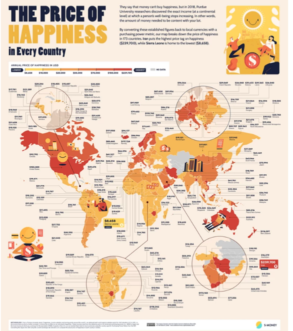 Czy za pieniądze można kupić szczęście? Okazuje się, że tak, zgodnie z badaniem przeprowadzonym przez amerykański Purdue University, w którym sprawdzono, ile pieniędzy ludzie potrzebują, aby być szczęśliwymi. Badanie wykazało, że optymalna kwota pieniędzy potrzebna do szczęścia różni się na całym świecie. Naukowcy wykazali ile pieniędzy rocznie w 2023 r. obywatele 173 krajów potrzebują, aby być szczęśliwymi. Szczęście w Iranie jest najdroższe. Obywatele tego kraju potrzebują 239 700 dolarów rocznie. Na drugim miejscu znajduje się Jemen (172 140 dolarów, a następnie Australia ( 188 727 dol) Na dziesiątym miejscu są Stany Zjednoczone, których mieszkańcy potrzebują 105 000 dolarów, aby być szczęśliwymi. Według badania przeprowadzonego przez S Money, szczęście jest najbardziej przystępne cenowo w Sierra Leone w Afryce, gdzie poziom szczęścia osiąga poziom 8 658 dolarów. Wielka Brytania zajmuje 18. miejsce i Brytyjczycy potrzebują 85 440 dolarów. W Polsce żeby osiągnąć pełnie szczęścia trzeba zarabiać średnio 21,864 dolarów a u naszych sąsiadów sytuacja wygląda następująco: Białorusini muszą zarabiać 16,759 dolarów, Rosjanie 17,851 dolarów, Ukraińcy 16,594 dolarów.